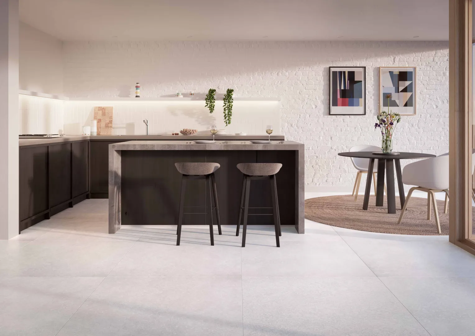 De richting waarin je jouw tegels legt, bepaalt mee de uitstraling van de ruimte. Wil je die verlengen of verbreden? In een lange, smalle kamer kan je door rechthoekige tegels dwars op de looprichting te leggen de ruimte visueel vergroten. Hou bij het bepalen van de richting ook rekening met vaste interieurelementen zoals een kookeiland, raampartijen of balken in het plafond. Een vierkante tegel zou je trouwens perfect diagonaal kunnen plaatsen, maar dat is vandaag niet echt meer in de mode. Twijfel je? Onze interieurspecialisten sturen je graag de goede richting uit.