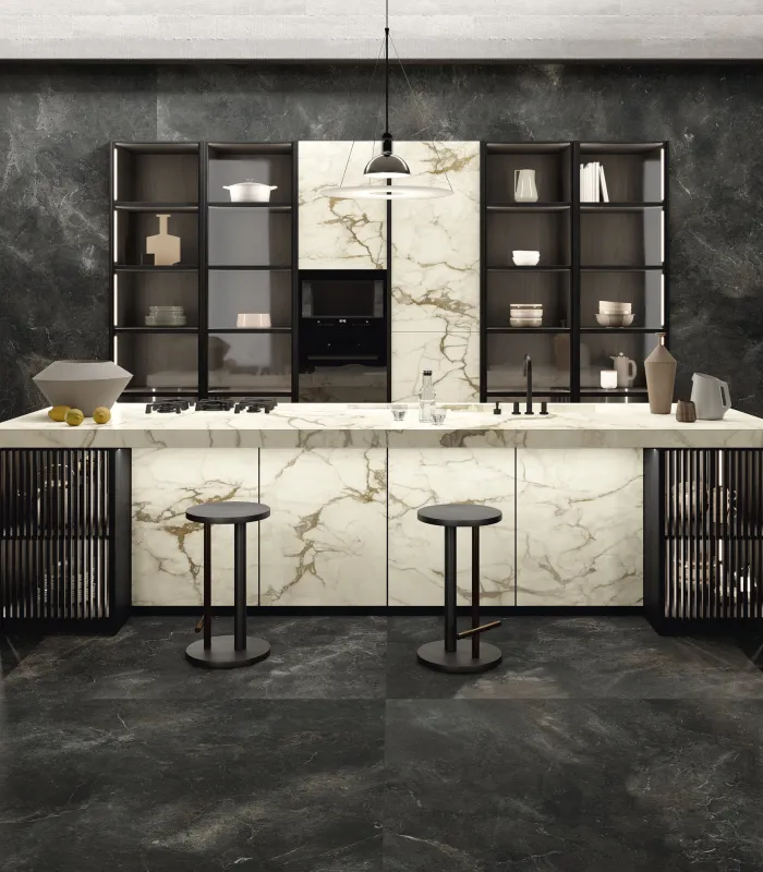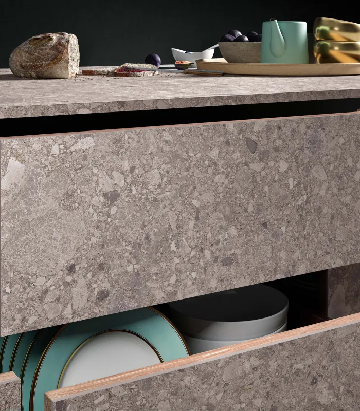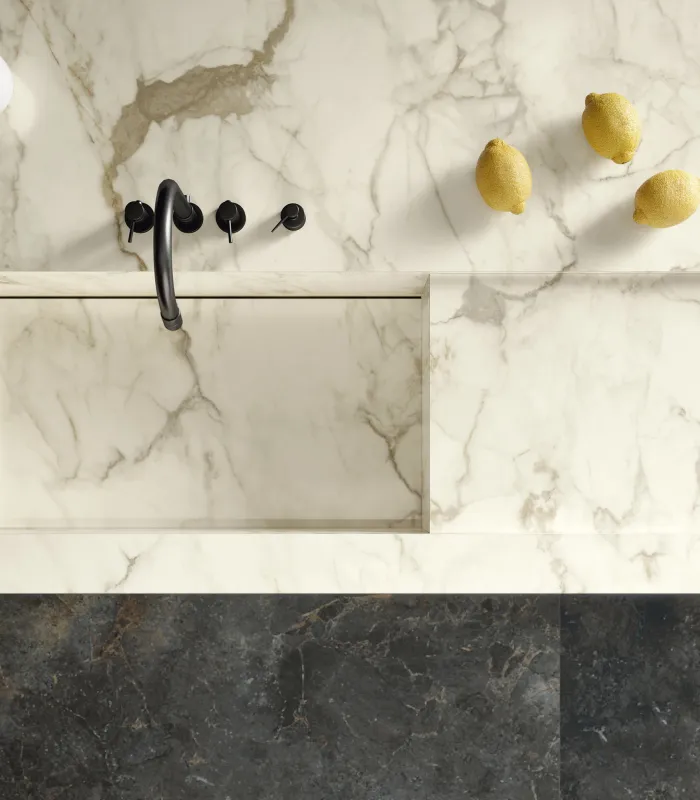 Mag het iets meer zijn voor je keuken? Een keukenblad in de stijl van je vloertegels of wandtegels, bijvoorbeeld? Vraag dan bij je Tyles Expert naar onze maatwerkoplossingen. Onze Superlarge keramische tegelplaten van 6 of 12 mm lenen zich uitstekend voor maatwerk. Het voordeel van zo’n op maat gemaakt keukenblad? Je kiest de look die jij wil, er zijn bijna geen voegen, keramiek is hygiënisch (een must in de keuken!) en dankzij de kras-, water- en vlekbestendige toplaag blijft je keukenblad langer mooi. Je kan er bovendien probleemloos een warme ovenschaal op zetten… Iets voor jou?