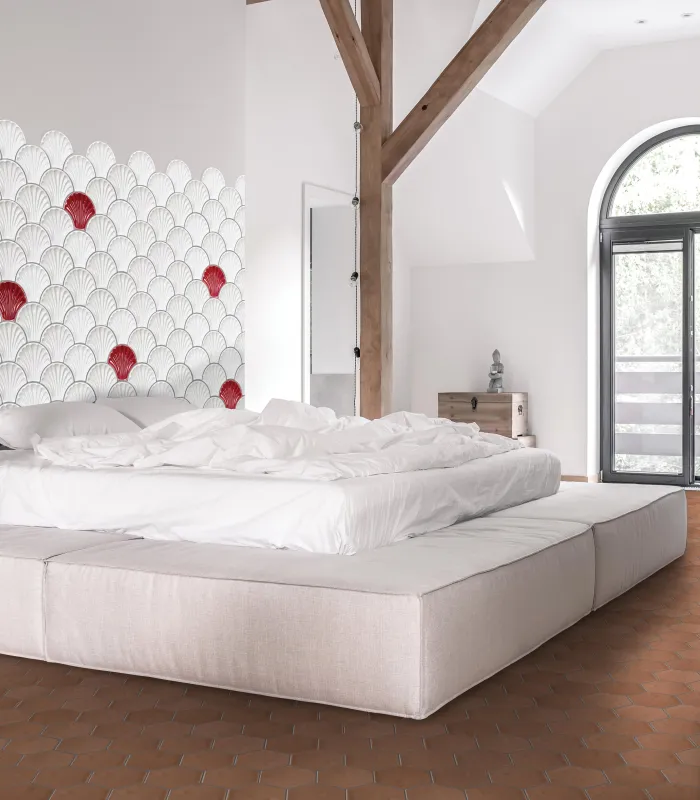 Je slaapkamer is de plek waar je ontwaakt en in alle kalmte de dag terug beëindigt. Het inrichten van een slaapkamer is daarom een hele uitdaging. Door gebruik te maken van warme en zachte kleuren en materialen trachten we met onze keramische tegels een plek van geborgenheid en rust te creëren.